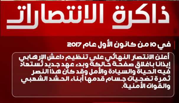 أعلن الانتصار النهائي على تنظيم داعش الإرهابي إيذانا باغلاق صفحة حالكة وبدء عهد جديد تستعاد فيه الحياة والسيادة والأمل وقد كان هذا النصر ثمرة تضحيات جسام قدمها أبناء الحشد الشعبي والقوات الأمنية.