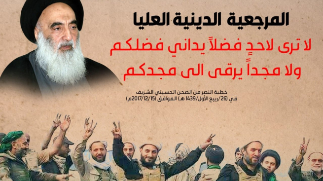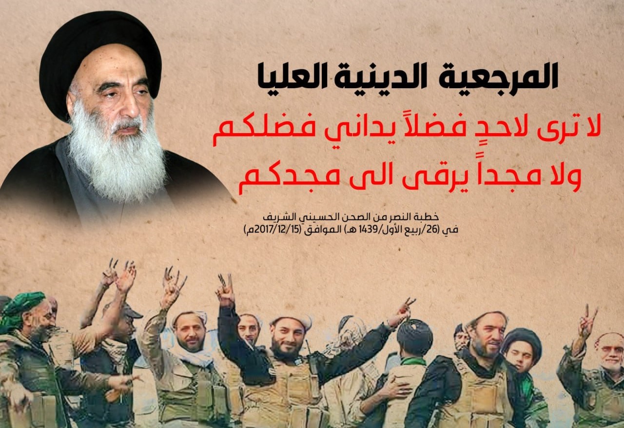 إن المرجعية الدينية العليا صاحبة فتوى الدفاع الكفائي التي سخّرت كل إمكاناتها وطاقاتها في سبيل إسناد المقاتلين وتقديم العون لهم، وبعثت بخيرة أبنائها من أساتذة وطلاب الحوزة العلمية إلى الجبهات دعماً للقوات المقاتلة وقدمت العشرات منهم شهداء في هذا الطريق... لا ترى لاحدٍ فضلاً يداني فضلكم ولا مجداً يرقى إلى مجدكم في تحقيق هذا الإنجاز التاريخي المهم.. فلولا استجابتكم الواسعة لفتوى المرجعية وندائها واندفاعكم البطولي إلى جبهات القتال وصمودكم الأسطوري فيها بما يزيد على ثلاثة أعوام لما تحقق هذا النصر المبين...