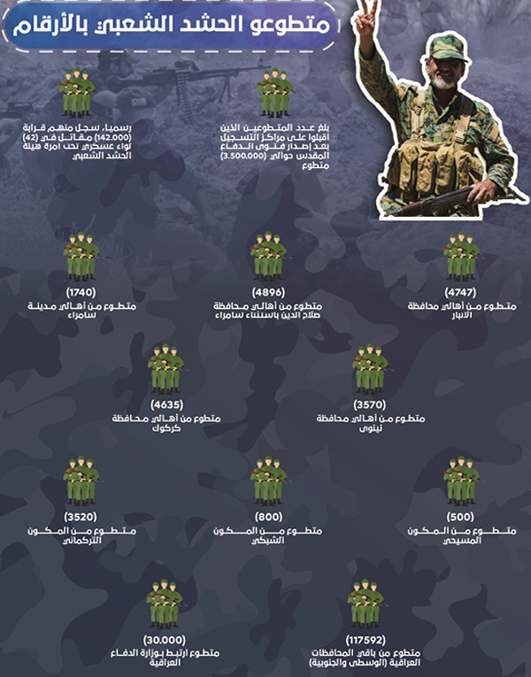رسمياً سجل منهم قرابة (142.000) مقاتل في (42) لواء عسكري تحت إمرة هيأة الحشد الشعبي، وتوزعت اعداد المتطوعين على عدة محافظات وهي كالآتي: