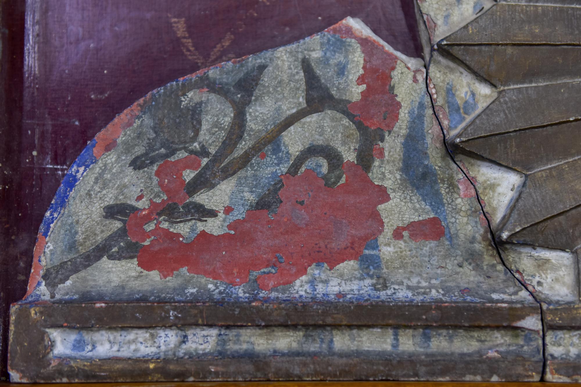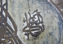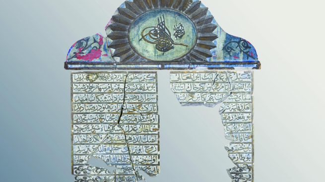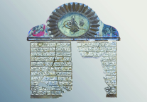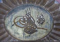 وتظهر على قطعة الرخام الأولى نقوش نباتية ملونة تتوسطها طغراء السلطان عبد الحميد خان، وهي عبارة عن توقيعه الرسمي، ومنفذة داخل دائرة يحيط بها نقش زخرفي بارز على هيأه شعاع الشمس، إذ تُعد هذه القطعة وثيقة تاريخية تعرضت في الانتفاضة الشعبانية لأضرار كبيرة أدت إلى تفتتها وانفصالها إلى أجزاء عدة.