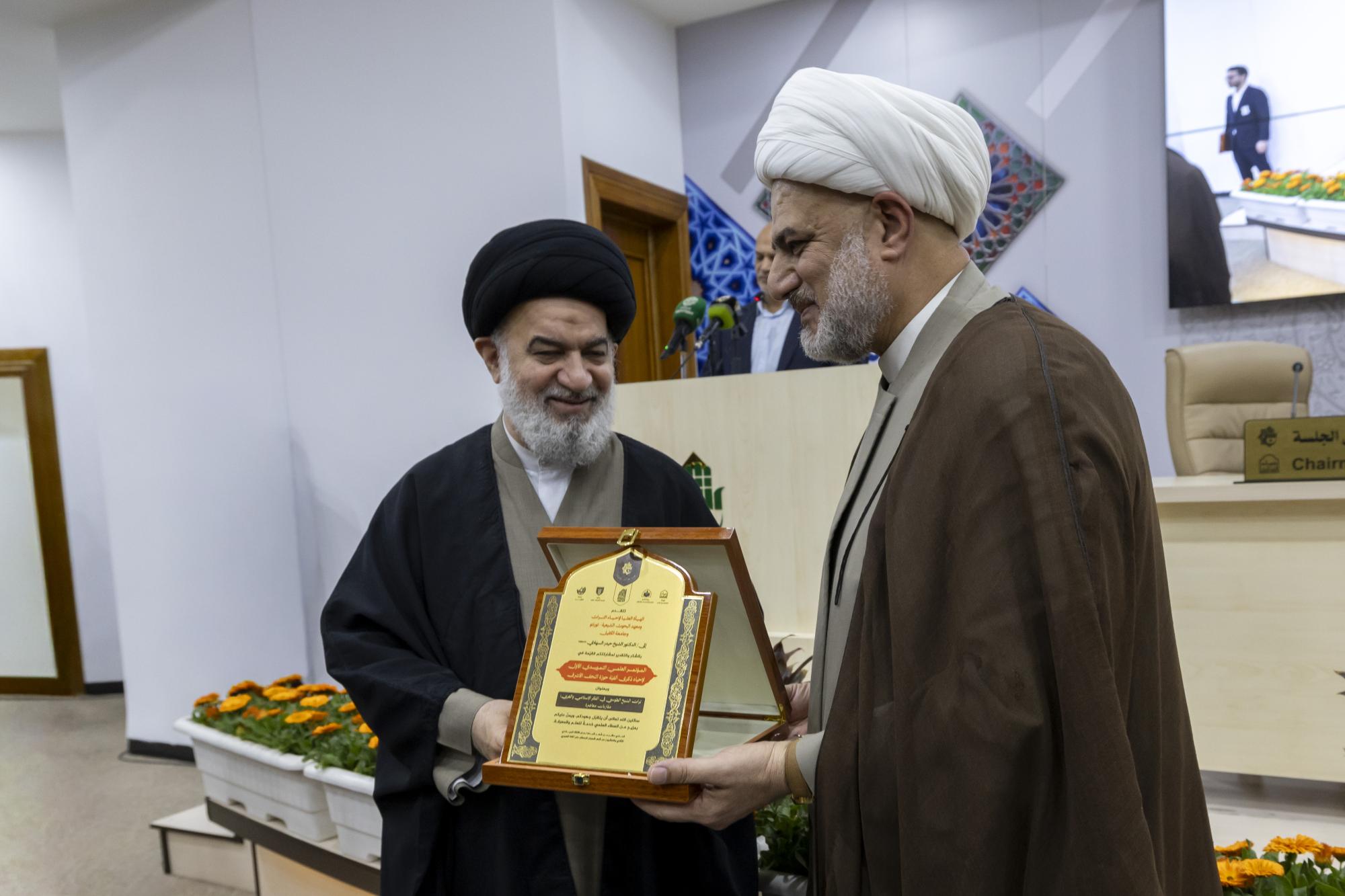 كرّم المتولّي الشرعيّ للعتبة العبّاسية المقدّسة سماحة العلّامة السيد أحمد الصافي، المشاركين في الجلسة البحثية الافتتاحية للمؤتمر العلميّ التمهيديّ الأوّل لإحياء ذكرى ألفية حوزة النجف الأشرف.