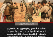 في مثل هذا اليوم الحشد الشعبي يعلن تحرير سد العظيم في محافظة ديالى من سيطرة عصابات داعش الإرهابية عام 2015 م، بعد تكبيدها خسائر فادحة بالأرواح والمعدات.