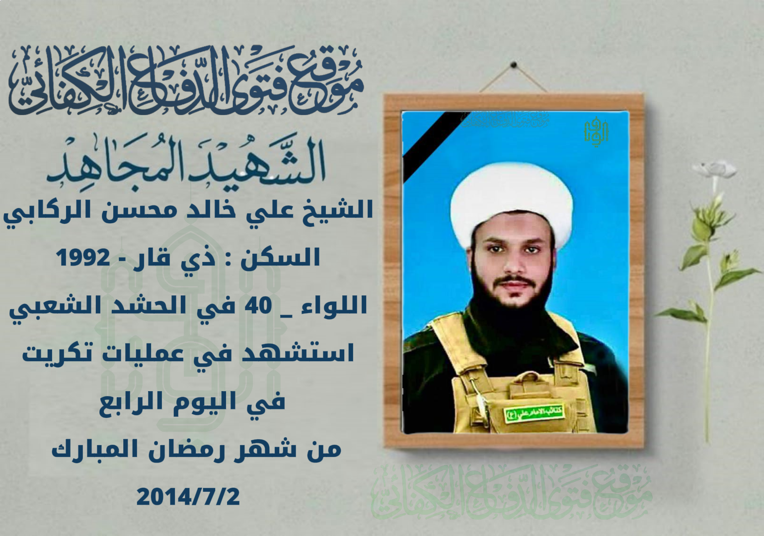 يستذكر موقع فتوى الدفاع الكفائي، في هذه الأيام المباركة، الذكرى السنوية لعروج الشهيد المجاهد علي خالد محسن الركابي، الذي لبّى نداء المرجعية الدينية العليا عقب صدور فتوى الدفاع الكفائي من قبل سماحة المرجع الأعلى علي الحسيني السيستاني في مدينة النجف عام 2014، فكان من أوائل المستجيبين، بل أول شهداء الحوزة العلمية بعد الفتوى المباركة.