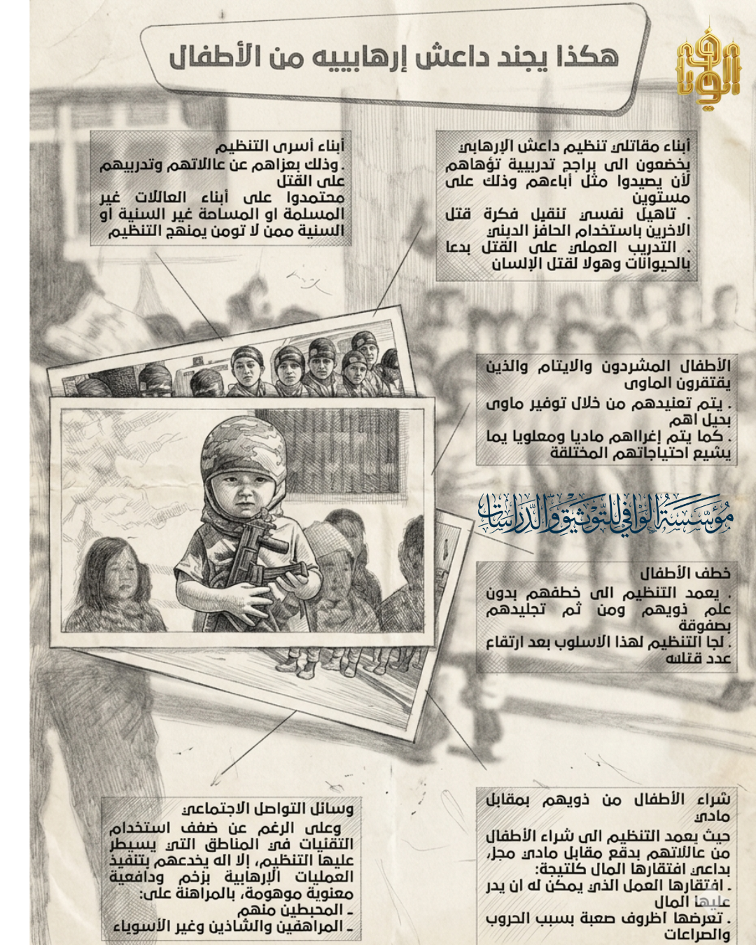حيث يعمد التنظيم الى شراء الأطفال من عائلاتهم بدفع مقابل مادي مجز، بداعي افتقارها للمال كنتيجة: افتقارها للعمل الذي يمكن له ان يدر عليها المال وتعرضها لظروف صعبة بسبب الحروب والصراعات.