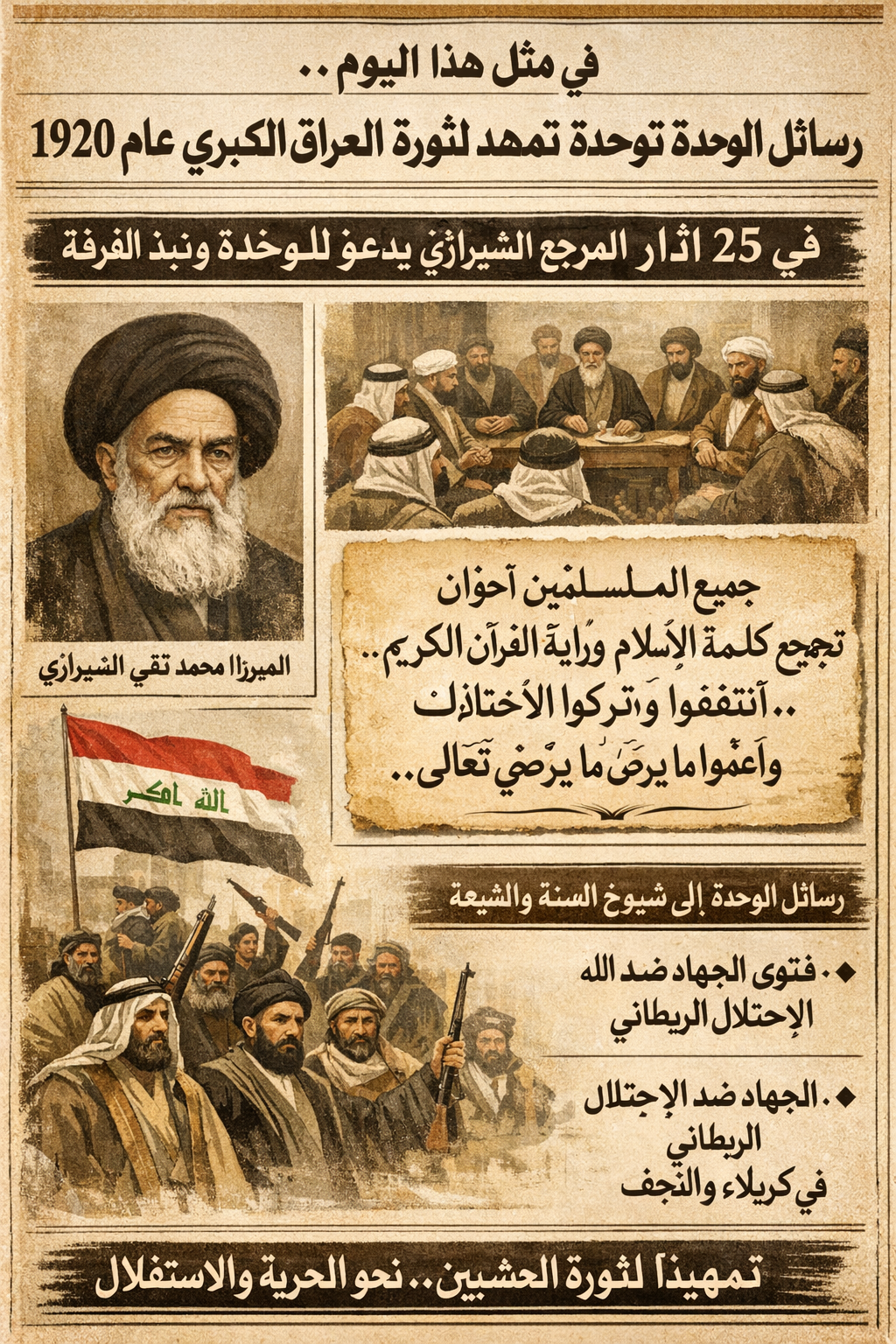 في مثل هذا اليوم، 25 آذار 1920م، سطّر المرجع الديني الميرزا محمد تقي الشيرازي واحدةً من أبرز ملامح الوعي الوطني العراقي، حين وجّه رسائل تاريخية هدفت إلى ترسيخ وحدة الصف ونبذ الفرقة، في مرحلة مفصلية سبقت اندلاع ثورة العشرين.