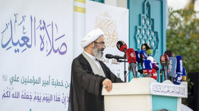 أيّها الأحبة، إنّ العيد وإنْ كان يحمل في طيّاته معاني السرور، إلّا إنّ قلوب المؤمنين لتتقطّعُ اليوم وهي ترى ما يحلّ بأشقّائنا وإخواننا في الدين والإنسانية من ويلاتٍ ومآسٍ، ففي الوقت الذي نكبّر فيه الله فرحًا بنعمته، تتعالى صرخاتُ الأطفال وتنهمر دموعُ الثكالى وتتصاعد ألسنة اللهب، فوق بيوت الآمنين في إيران ولبنان مع تواصل العدوان العسكريّ عليهما.